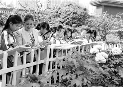 菏泽市牡丹区牡丹小学师生在当地牡丹园里写生。