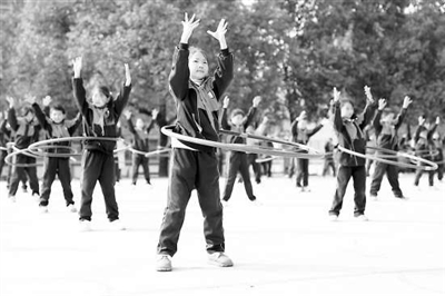 贵州省黔东南苗族侗族自治州岑巩县水尾镇马家寨小学学生在大课间转呼啦圈。 通讯员 唐鹏 摄
