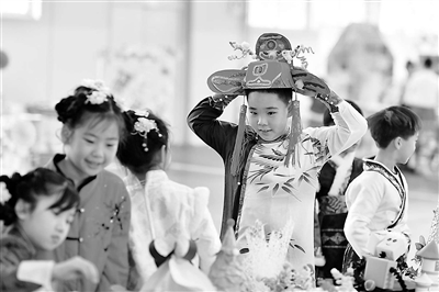 12月22日,在山东省青岛市市北区福州路小学开展的传统文化成果展示活动上,一名学生在试戴帽子。 王海滨 摄