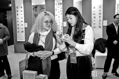 在2025世界中文大会上,中外学生交流中国传统篆刻艺术。