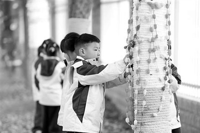 12月23日,江西省上饶市余干县实验幼儿园的小朋友们用毛衣与零散毛线,认真地为大树“穿衣”。韩海建 摄