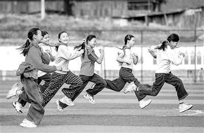 ▲贵州省从江县刚边壮族乡中心小学学生在进行趣味跑。