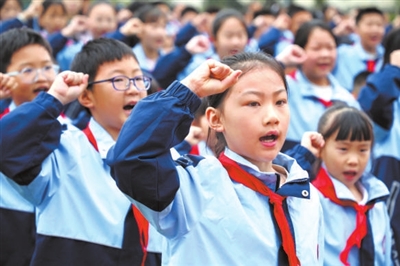 安徽省六安市裕安区紫荆小学少先队员在宣誓。田凯平 摄