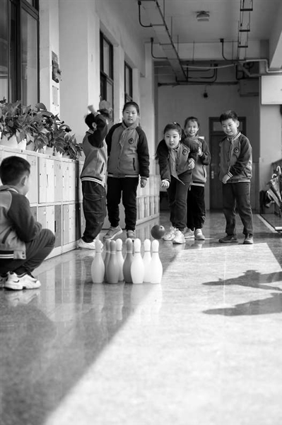 浙江省杭州市凤凰小学学生在课间体验趣味保龄球项目。学校供图