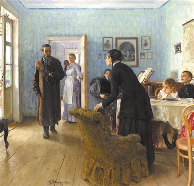 19世纪80年代,俄国社会思潮激荡,激进的知识青年群体成为列宾关注的焦点。为中国观众所熟悉的《意外归来》,将革命者的悲剧性以戏剧化的方式推向极致。这幅作品如同电影场景的瞬间定格:面对突然归家的革命者,屋内的妻子、孩子、母亲以或惊喜、或好奇、或震惊的神情呈现于画面,所有人物都传神地诠释着“意外”二字。列宾像一位高明的电影导演,构建了一个充满张力的戏剧场景,将人物的内心活动入木三分地表现出来,引发观者对那些孤注一掷的理想主义者的悲剧命运进行深入思考。