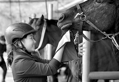 训练后,高三学生王燕琪给“黑豹”(马名)洗澡。