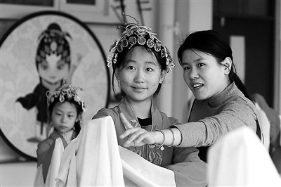 ①山东潍坊高密市崇实小学的学生在戏曲老师的指导下练习茂腔。