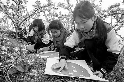 ②重庆市云阳县蔈草镇歧阳小学开展“识花·画花·咏花”主题实践课,图为学生在梨园作画。