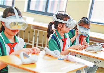 在上海市宋校嘉定实验学校科技节的“科普游园”活动中,学生正在参加“3D虚拟视界”项目。学校供图