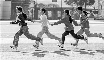 1月13日,贵州省从江县刚边壮族乡中心小学学生在体育课上参加趣味跑游戏。 罗京来 摄