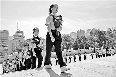 丹东市实验小学学生在抗美援朝纪念馆向烈士献花。 学校供图