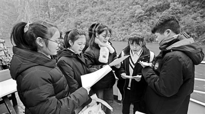 ① 重庆市巫山县职业教育中心导游专业学生在小三峡游轮上用英语练习景区介绍。