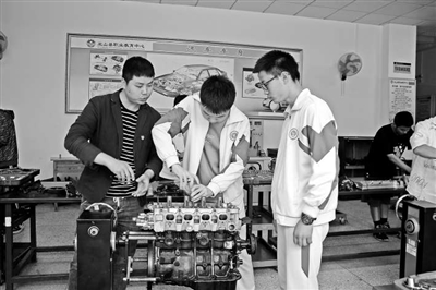 ② 重庆市巫山县职业教育中心汽修专业教师在教学生如何用英语解说维修过程。 资料图片