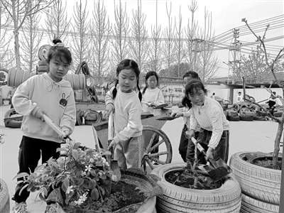 河南省济源市梨林镇梨林小学学生在废轮胎里植绿。资料图片