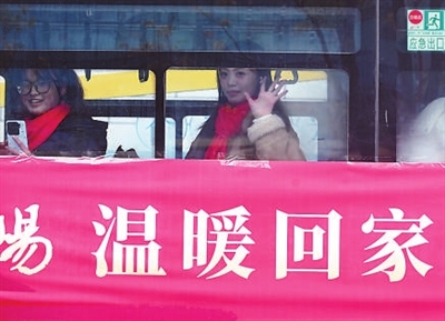 近日,阜阳幼儿师范高等专科学校,乘坐免费大巴车前往火车站的学子向老师挥手告别。张洪金 摄