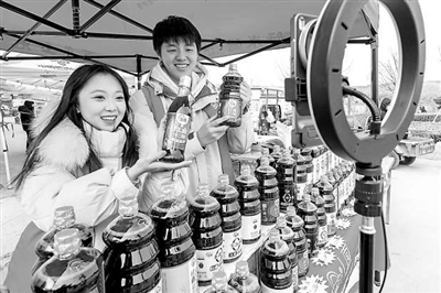 近日,在山东省淄博市周村区韩家窝村年货大集上,山东轻工职业学院“数商兴农”直播团队的学生主播正在向网友推介当地特产。据悉,该团队连续4年开展电商助农实践,累计进行公益直播近300场,帮助区域农户增收超百万元。