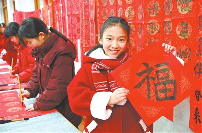 春节临近,多地组织有书法特长的学生为社区居民义务书写春联和“福”字,用墨香送上新春祝福。