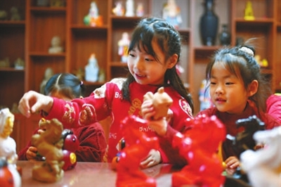 近日,山东省青岛市城阳区的孩子们走进当地泥塑非遗工坊,观赏马年生肖泥塑。王海滨 摄