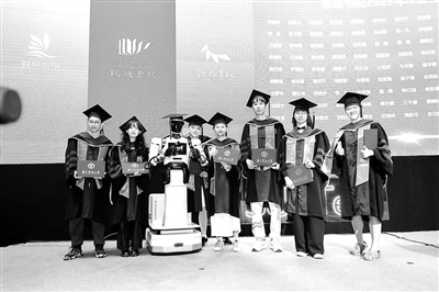 ①南方科技大学自主研发的人形机器人“南科盘古”在毕业典礼上与学生们互动。 学校供图