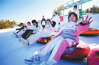 雪圈滑道上,学生们挥手笑迎即将到来的飞驰。