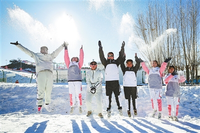 参加冰雪研学活动的内蒙古自治区鄂尔多斯市东胜区第十五中学高中部学生齐跃扬雪,青春朝气在冰雪间绽放。