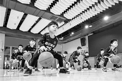 2月3日,在庐阳区全民健身体育中心,小朋友们正在练习打篮球。