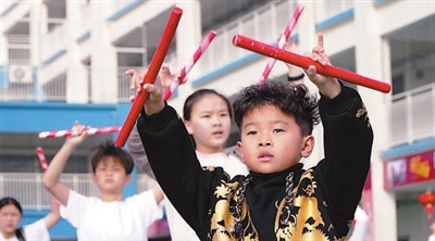 图④广东普宁市南山小学学生在练习英歌舞。本报记者 任赫 摄