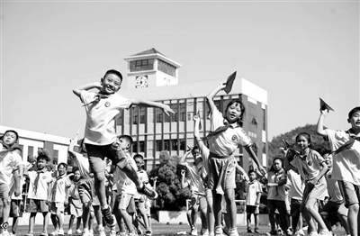 在秋季开学第一课,博才云时代小学学生放飞自己精心书写的彩色纸飞机。 王媛 摄