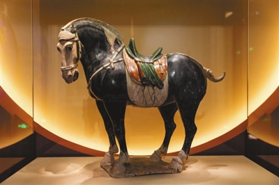 120余件(套)与马相关的文物展品犹如一幅主题画卷徐徐展开:西汉绵阳木胎漆马,髹黑漆,施朱彩,昂首振鬃,雄健中带着蜀地独有的气韵;青州彩绘陶马,络头当卢齐备,杏叶垂坠,纹饰精巧,将实用与审美融为一体;唐马雕塑一改秦汉时期古拙之风,展现高昂彪悍之姿,其中的三彩黑釉陶马,造型雄健,黑釉流光,是唐三彩马中不可多得的精品;宋代《狩猎图》中,骏马腾空,猎手逐猎,马具服饰兼具辽金风韵与中原笔法,是多民族文化交融的艺术结晶;至明清,马的祥瑞寓意愈发深厚——青玉海马驮书带饰,以龙马负图的上古典故,承载着文运与天命的美好寄托;道光粉彩四马图碗,四马悠然,姿态各异,以闲逸之态隐喻海晏河清、天下太平;西洋画师艾启蒙笔下的《十八骏图卷》,融中西画法于一体,骏马毛发纤毫毕现,动态灵动……从雕塑到绘画,从玉器到瓷器,马已然化作昂扬奋进、志在千里的精神符号,融入中国人的精神血脉。