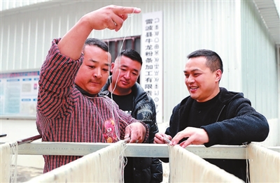 四川省教育厅驻村帮扶干部陈磊(右)、赵睿祥(中)走进雷波县永盛镇欧家山村农户家中,探讨特色腊肉产品的加工与销售。