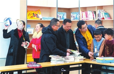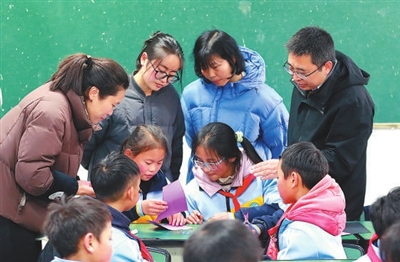 在雷波县永盛镇中心校,四川省教育厅驻村帮扶干部、四川省教育科学研究院教研员朱雪林(右一)发挥专业所长,指导基层教师创新课堂教学方式。