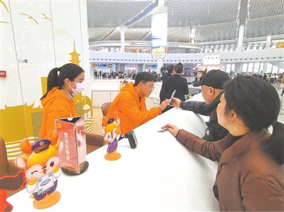 ①东华大学“小甜橙”志愿服务队队员在车站为旅客提供咨询服务。学校供图
