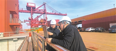 ④青岛理工大学教授刘俊伟(左)和尚文昌在董家口港万邦矿石码头采集数据。本报记者 刘淼 摄
