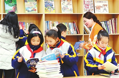 柳玲玲和学生们一起整理、上架学校新收到的一批捐赠书籍。