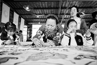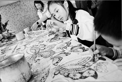 杭州市滨江实验小学学生与贵州省丹寨县羊甲小学学生共绘蜡染长卷。刘静 摄