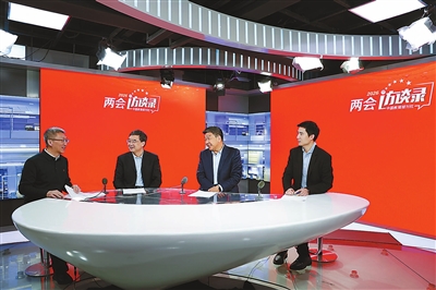 3月3日,全国政协委员,北京师范大学国家高端智库教育国情调查中心主任、教授张志勇(右二),中共北京市委教育工作委员会副书记、北京市教委主任李奕(左二),国家博物馆社会教育部主任、研究馆员周靖程(左一)做客中国教育报刊社“两会访谈录”。冯子琪 摄
