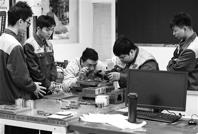图为杨登辉(中)指导学生提升器件加工精度。