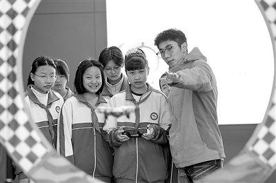 四川省眉山市彭山区第二中学学生在体验无人机激光射击。 通讯员 翁光建 摄