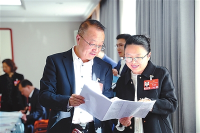 3月9日,十四届全国人大四次会议四川代表团举行小组会议,全国人大代表、四川省雅安市教育考试院院长庹庆明(左)同全国人大代表王丽,围绕教育话题进行交流。