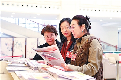 3月8日,全国政协十四届四次会议北京会议中心驻地,教育界别委员们专注研读报纸,为建言献策“蓄力”。本报记者 单艺伟 摄