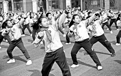 近日,河北省邯郸市丛台区曙光第四小学学生在练习邯郸成语广播体操。郝群英 摄