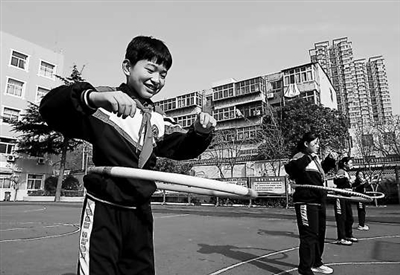 河北省邯郸市邯山区邯山小学的学生在操场上玩转呼啦圈。 周绍宗 摄