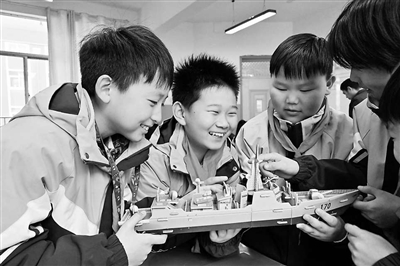 三月十七日,在河南省商丘市夏邑县育才学校,学生在“国际航海日”主题班会上观看手工制作的舰船模型。苗育才 摄
