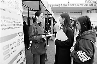 近日,甘肃省高师就业联盟2026届毕业生春季双选会在西北师范大学举行,用人单位在向前来求职的毕业生答疑解惑。西北师范大学供图