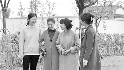 于洁和徒弟们在校园漫步,边走边答疑解惑。资料图片