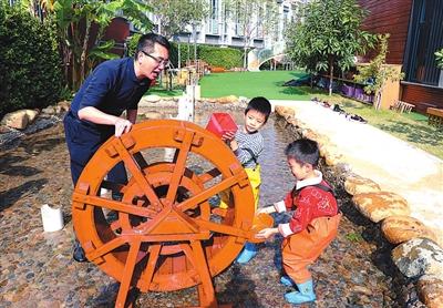 近日,在厦门市莲云幼儿园,曾是一名工程师的家长陈鑫峰,为孩子们现场讲解水车及抽水机的工作原理,并和孩子们玩起搭建水槽、连接水管的游戏。该园注重在真实情境中开展工程教育,聚焦真实问题、强调动手实践,引导孩子获得计划、合作、数学与工程认知以及艺术等多领域的综合性经验。