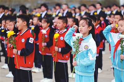 4月3日,少先队员在天津市青少年清明祭英烈主题团(队)日活动现场重温入队誓词。 新华社记者 李然 摄