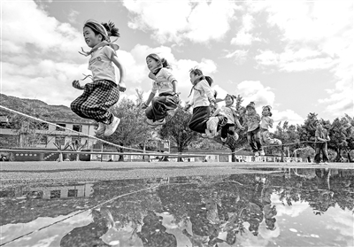 近日,贵州省从江县刚边壮族乡中心小学学生在课间参加跳绳运动。连日来,各地各校将“健康第一”教育理念融入日常教学,积极开展阳光体育课间活动,确保学生每天综合体育锻炼时间不低于2小时,让学生在体育运动中愉悦身心、增强体质,促进健康成长。