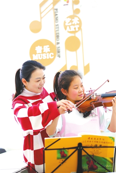 4月1日,在四川省乐山市犍为县一家艺术培训机构,志愿者老师指导小朋友学习小提琴。 李华时 李梦涵 摄