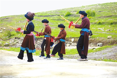 4月1日,在贵州省黔西市铁石苗族彝族乡铁盔山村,小朋友跟随当地芦笙手学吹芦笙。周训超 摄
